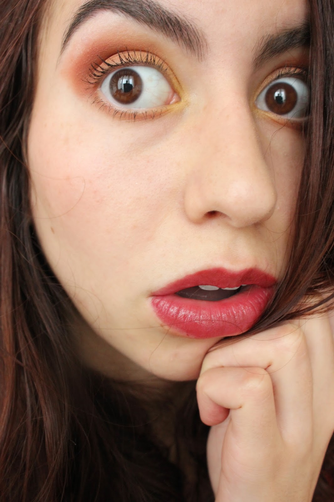 Mais bon, ça m'empêche pas d'utiliser des couleurs automnales. D'ailleurs, ton maquillage est un bel hommage à cette saison, c'est très joli et ça va super bien à ton teint. Même ton haut a l'air assorti à ton make up! Je vois aussi que tu as de quoi faire avec ta grande palette Sephora. Sinon en base, tu as continué tes recherches pour une base à paupière bio?