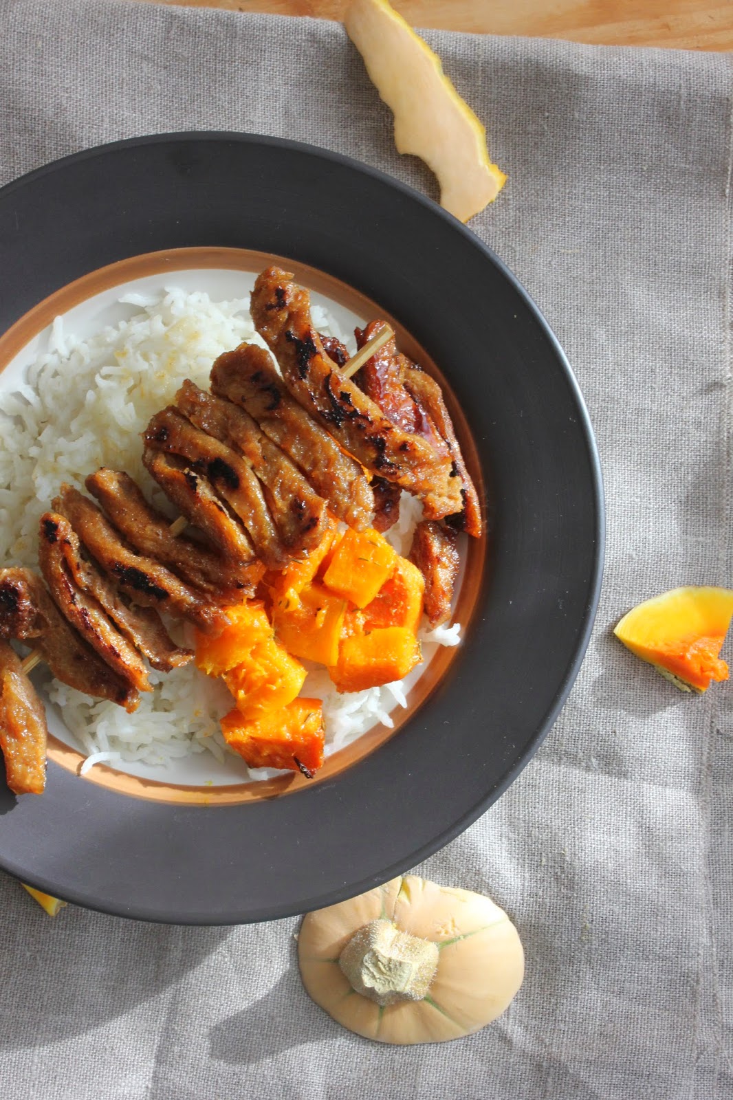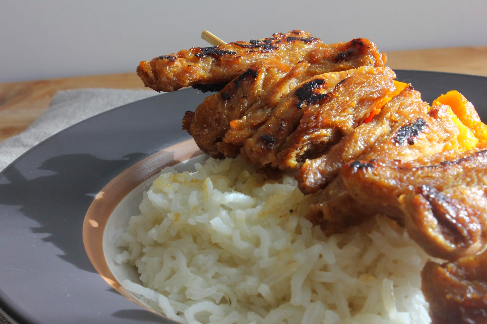 Brochette solitaire d’aiguillettes de soja caramélisées et leur accompagnement