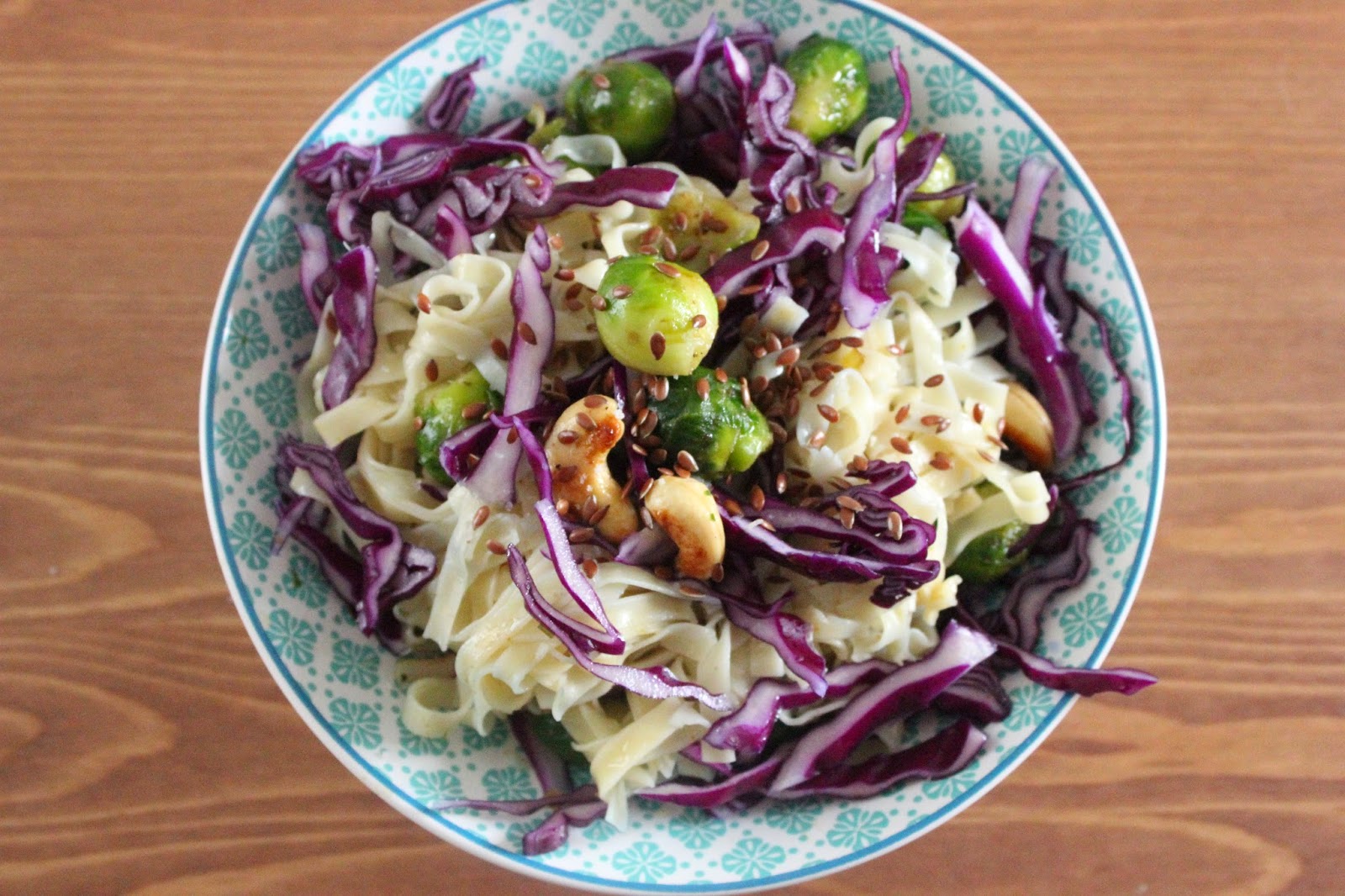 Repas 2 : Pâtes fraîches au chou rouge, choux de bruxelles et noix de cajou caramélisées au sirop d’agave, saupoudréees de lin brun