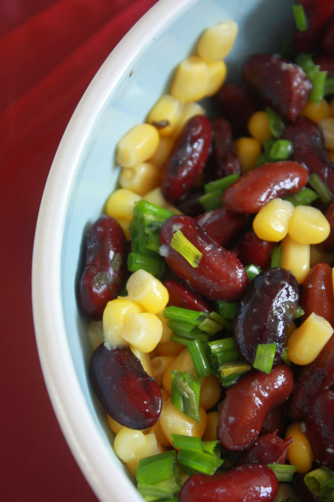 Prenez un joli bol de belle taille et garnissez le de vos haricots et grains de maïs, arrosez les avec amour de vinaigrette et ajoutez votre ciboulette avant de remuer afin que tout ce beau monde festoie ensemble.