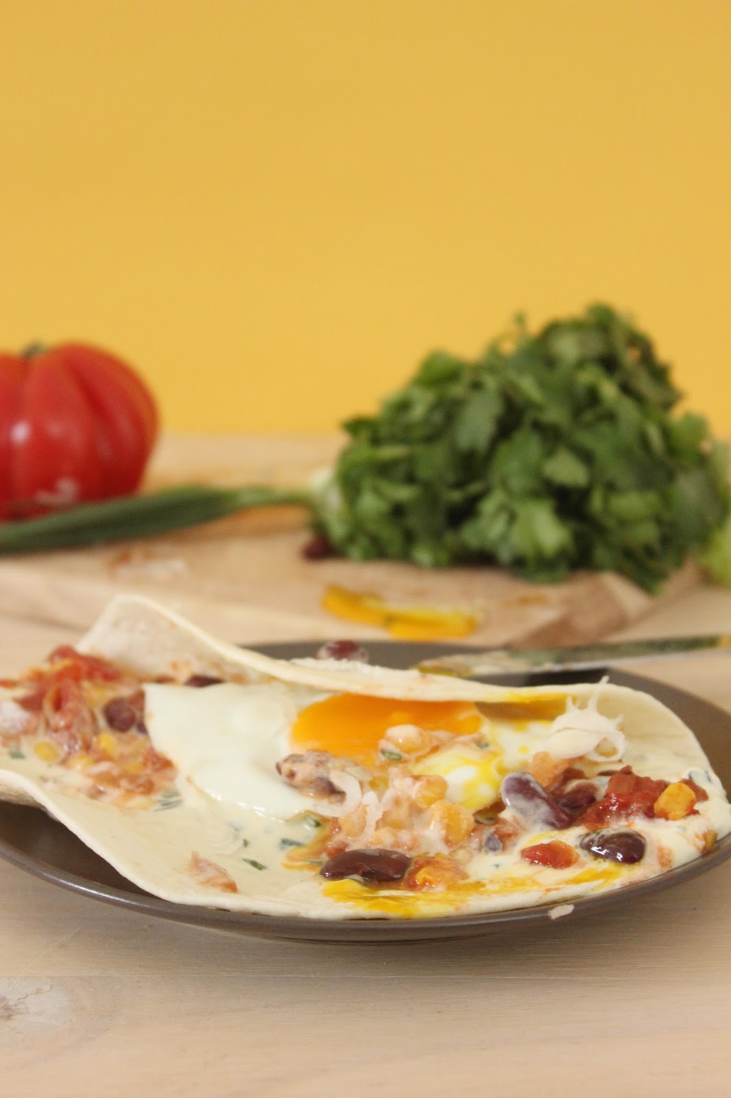 La marche à suivre est simple : une fine épaisseur de crème fraîche citron/ciboulette, un peu de sauce tomate, du mélange haricot/maïs et quelques feuilles de coriandre fraîche ! 🙂