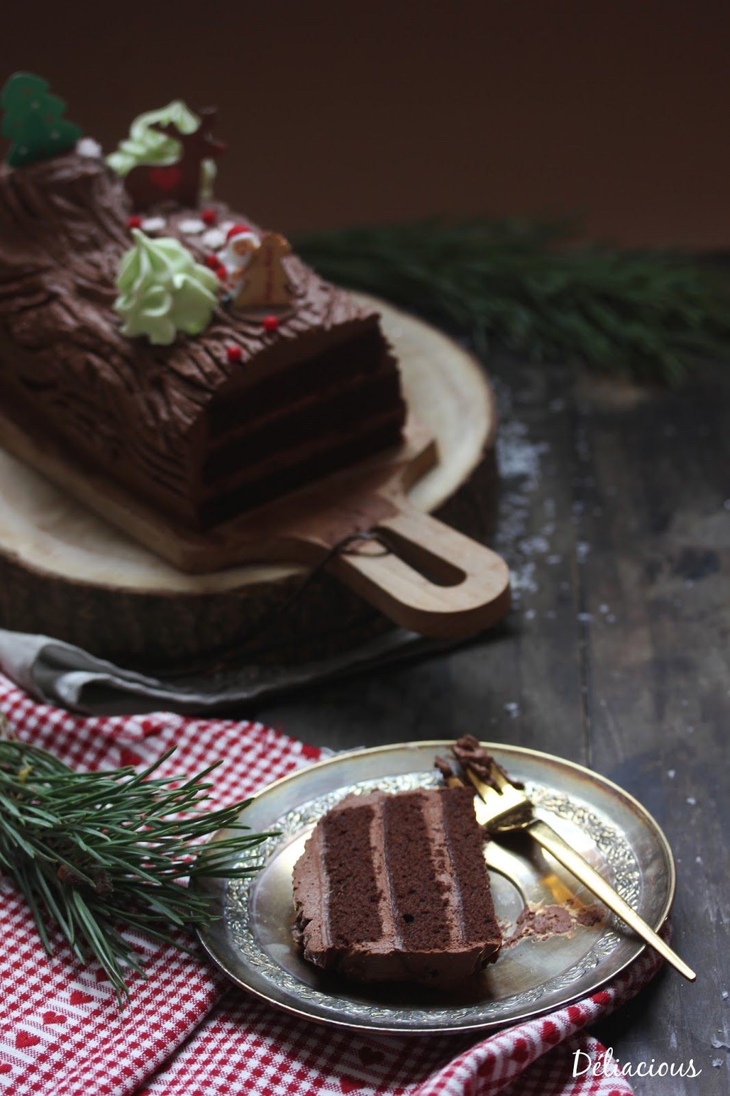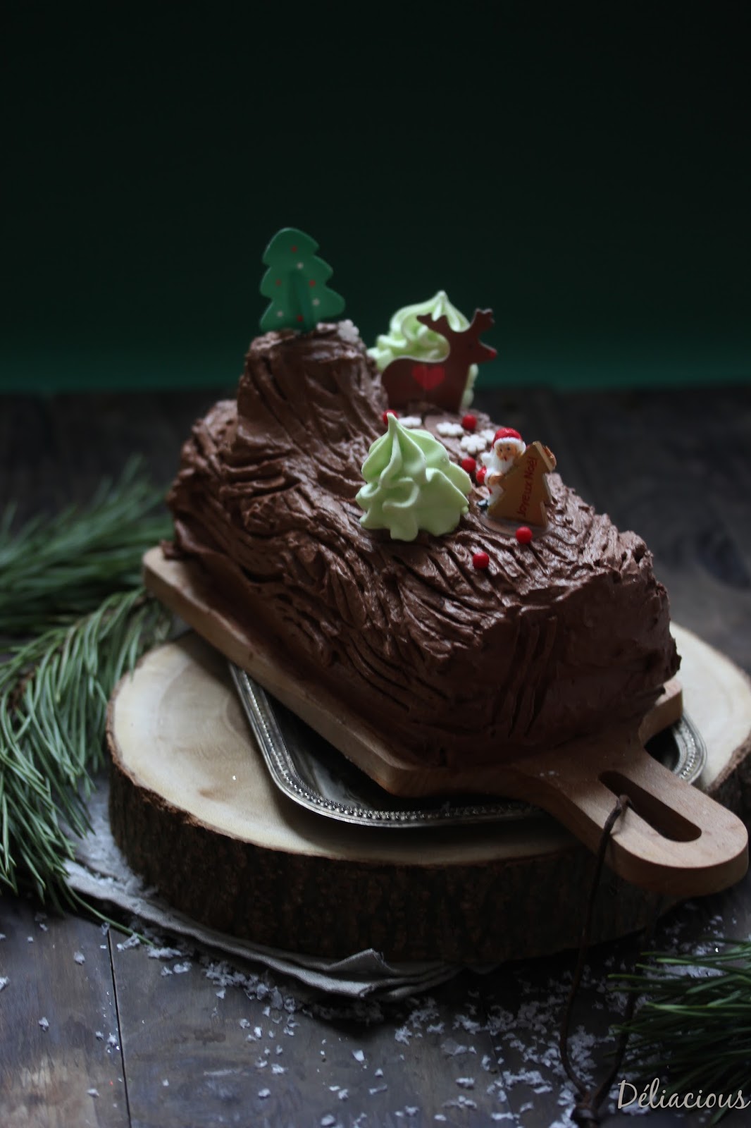 En tout cas, j’ai eu envie de faire un clin d’oeil à ces horribles bûches traditionnelles crème au beurre qui m’ont parfois fait faire des cauchemars tellement 1/ je déteste les manger 2/ je déteste les faire 3/ je les déteste