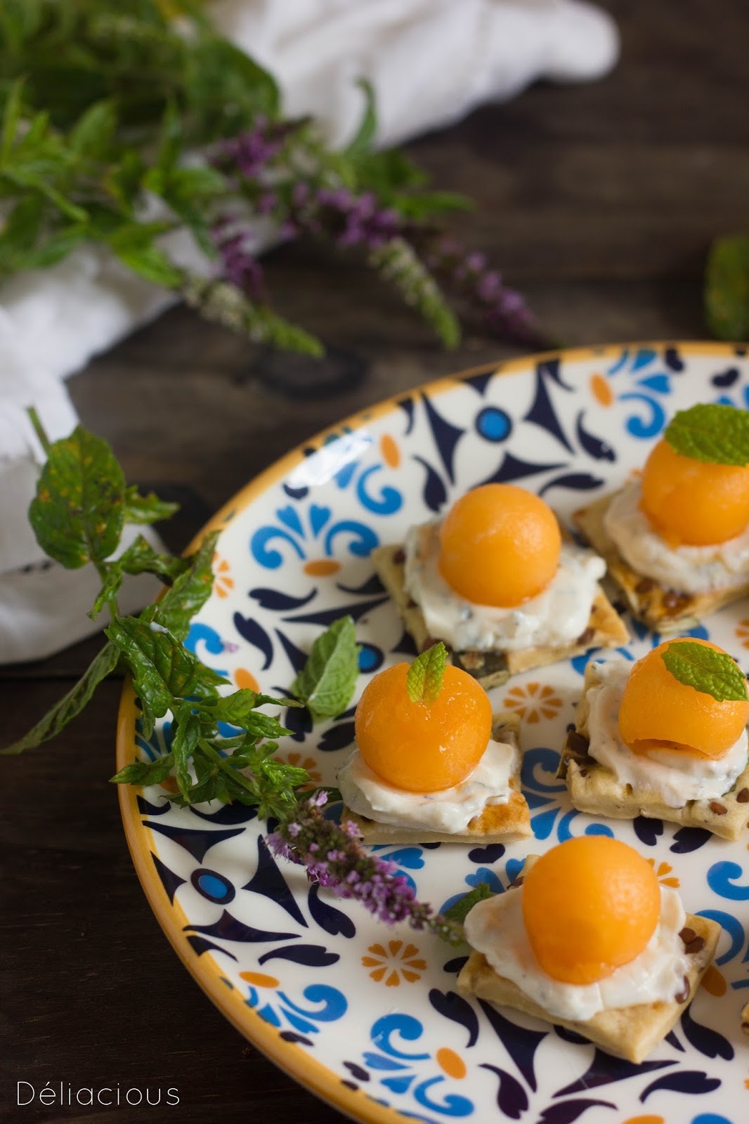 Crackers aux fromages frais à la menthe et au melon