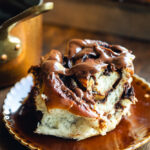 Des brioches roulées vegan à la cannelle, avec du cacao, et un glaçage chocolat, sur le principe des cinnamon rolls, recette d'automne bien connue et appréciée.